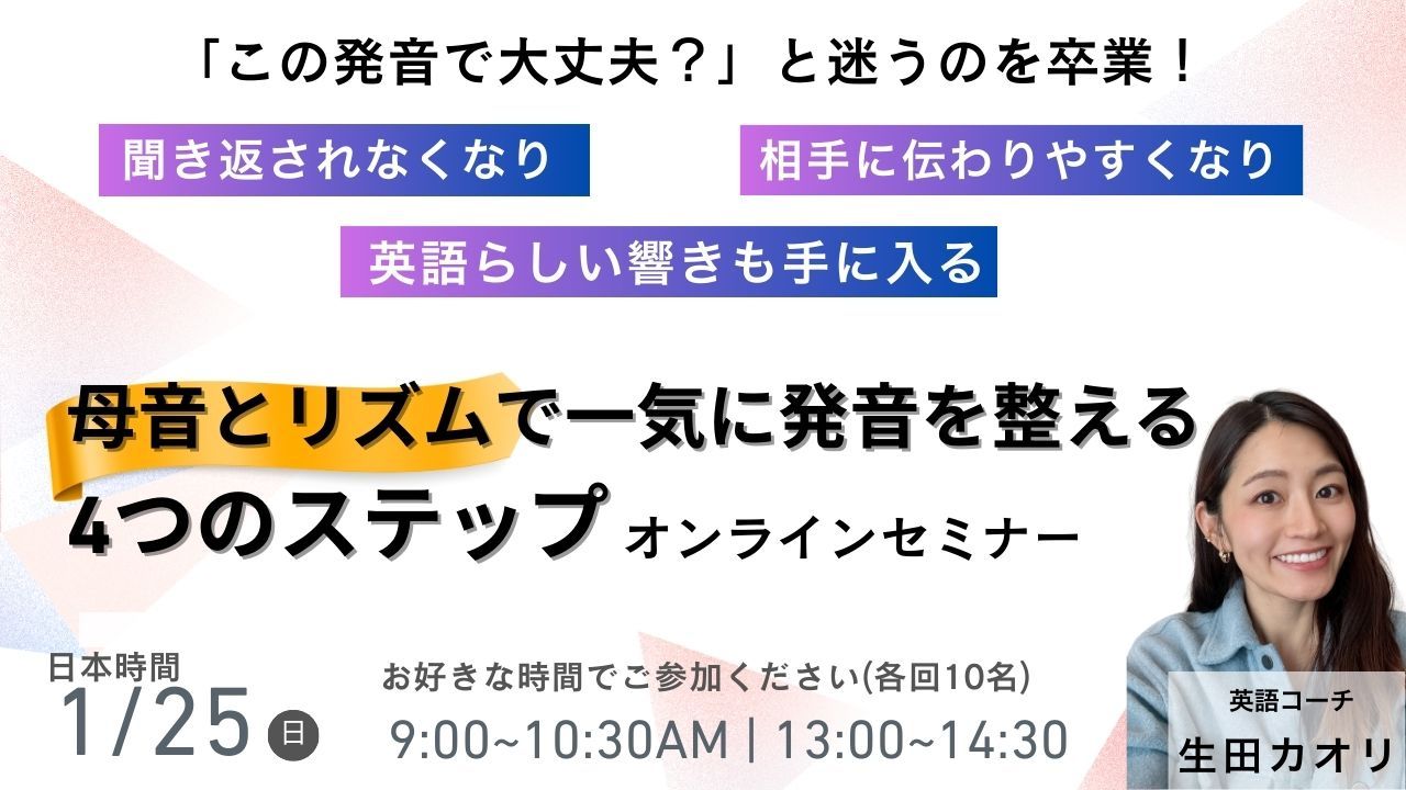 この発音講座では、革命的なColor Vowel®︎アプローチを取り入れ、英語の音とリズムを徹底的に学び、相手にとって聞き取りやすい発音を身につけます。